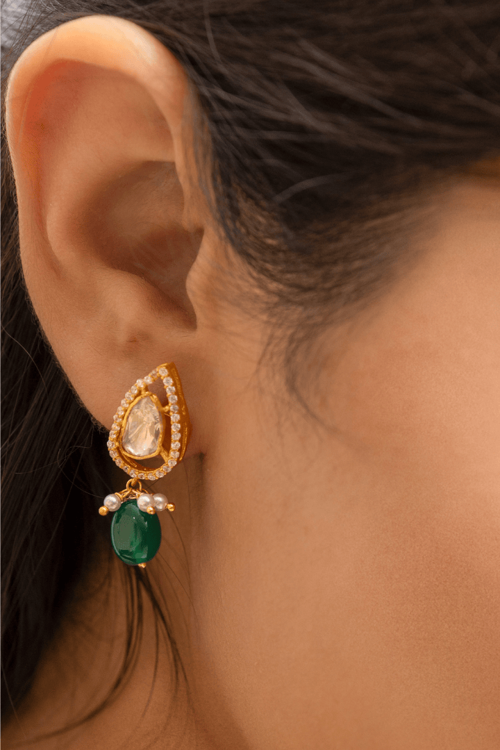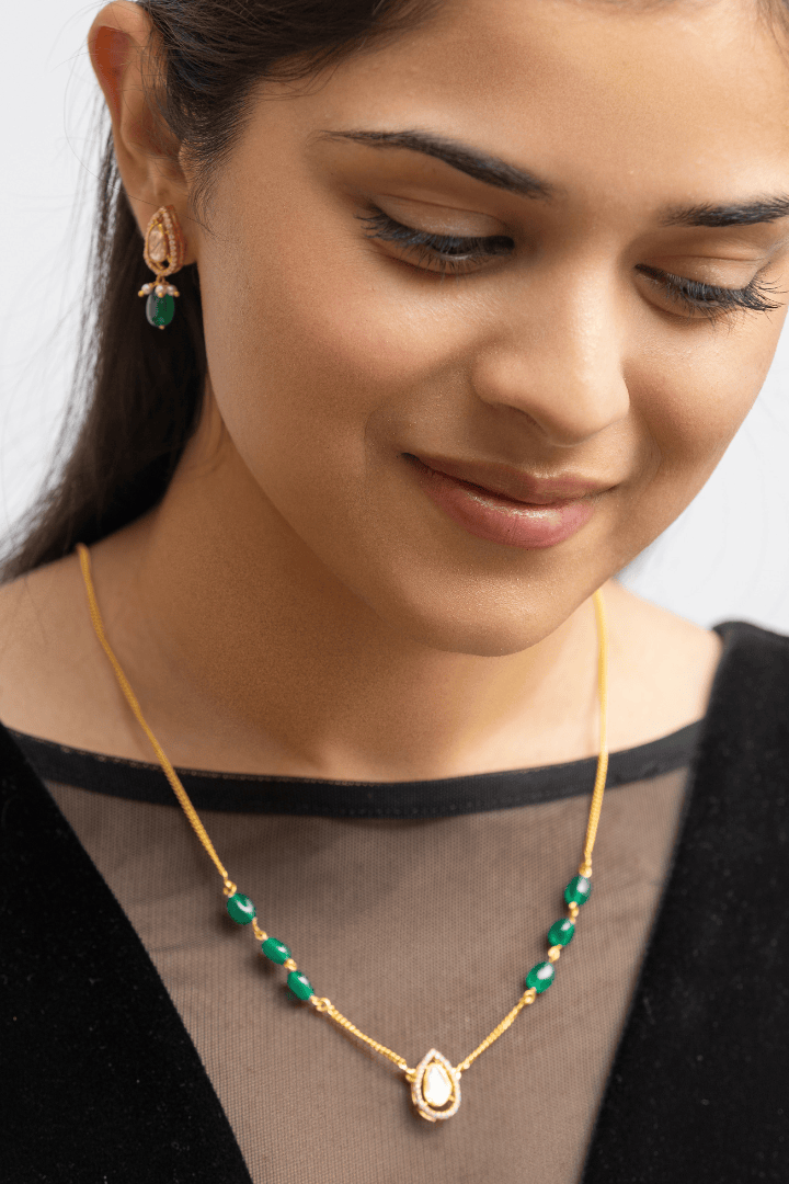 Light, graceful, and irresistibly elegant—the Aahana Emerald Whisper Set is designed for the woman who adores subtle luxury. The combination of rich green stones and a gold-plated kundan pendant creates a poetic harmony that enhances every neckline. Handcrafted in premium 92.5 silver with a lustrous gold finish, the necklace highlights a radiant teardrop centerpiece surrounded by delicate green accents. Fine craftsmanship gives this piece a timeless charm, while the minimalist silhouette makes it ideal for both traditional and modern ensembles. Aahana is your go-to for effortless sophistication.