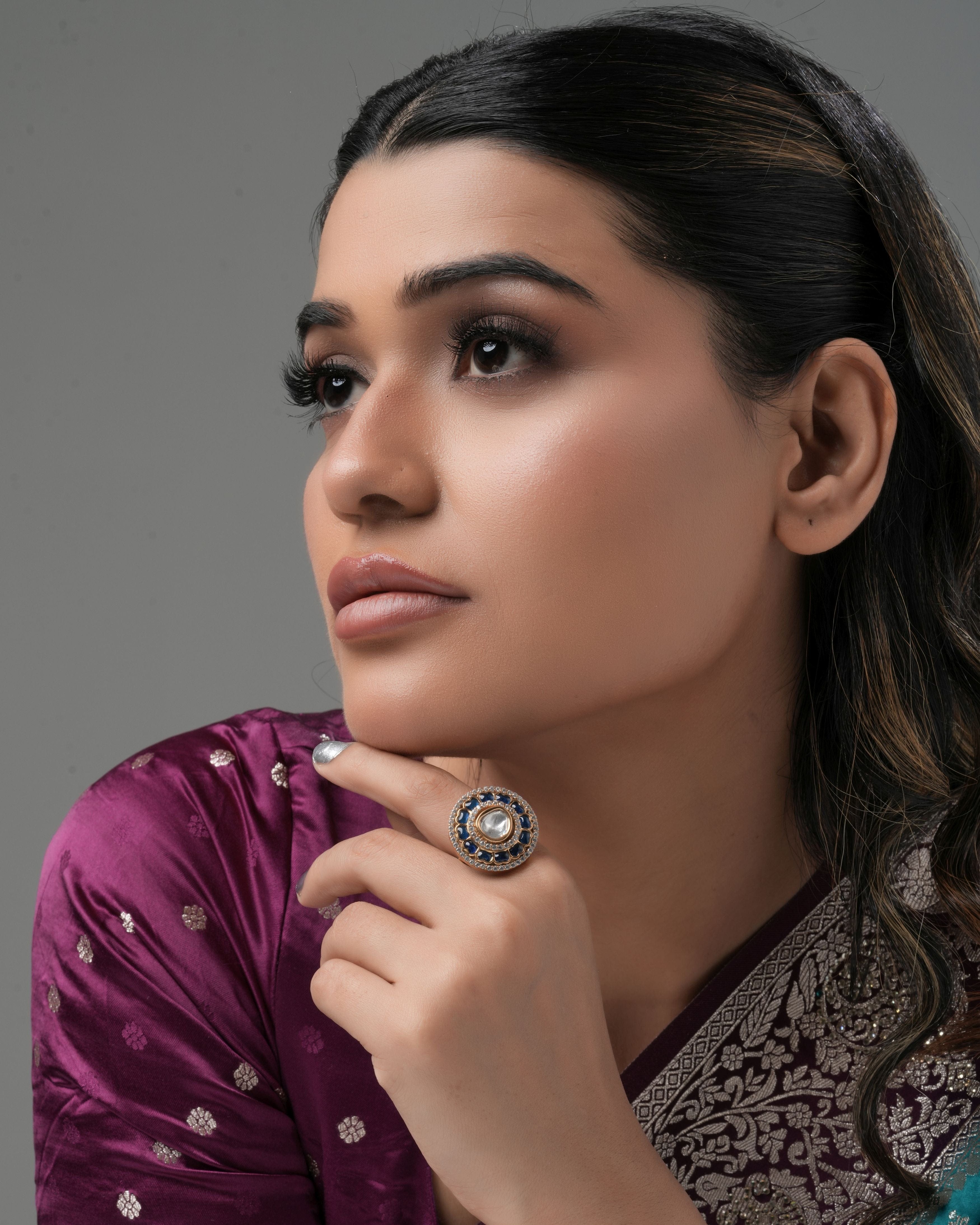 Channel timeless glamour with the Royal Sunburst Ring. At its heart sits a lustrous Moissanite , radiating classic charm. Surrounding it, deep sapphire hued glass “petals” form a bold sunburst motif, all framed by a halo of sparkling clear cubic zirconia. The adjustable, gold plated band setup in Epoxy setting ensures a comfortable fit, making this statement ring a versatile accent for both evening soirées and everyday chic.