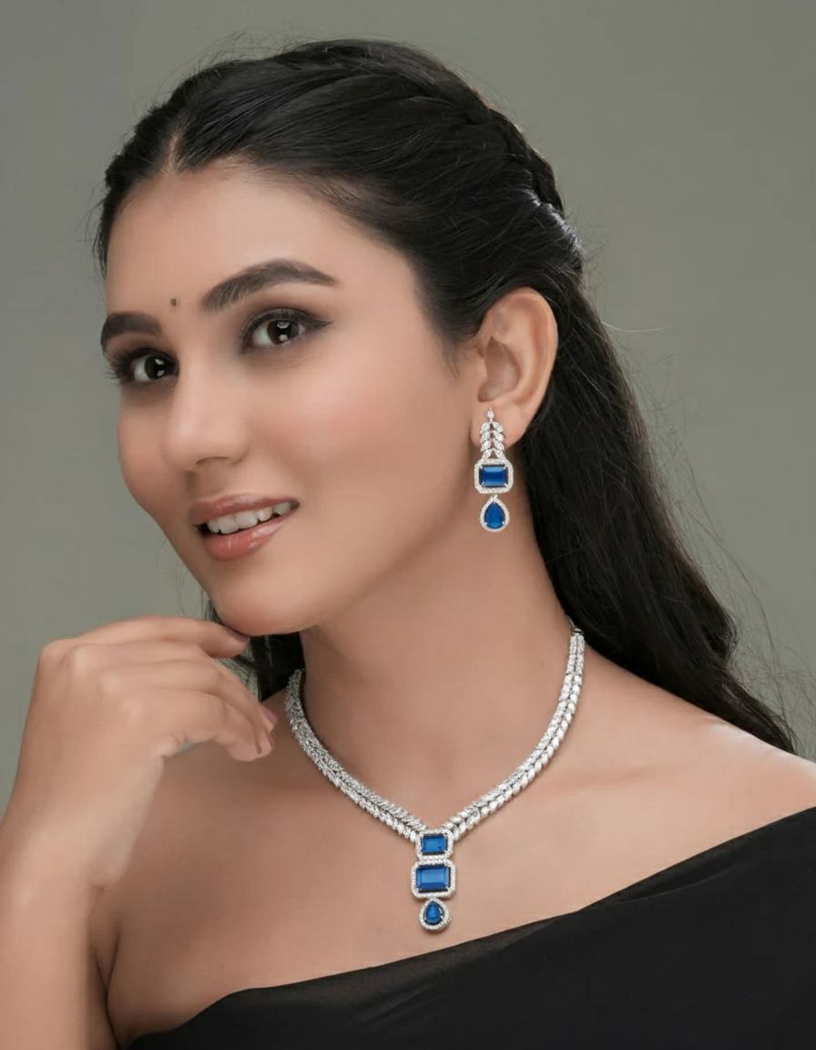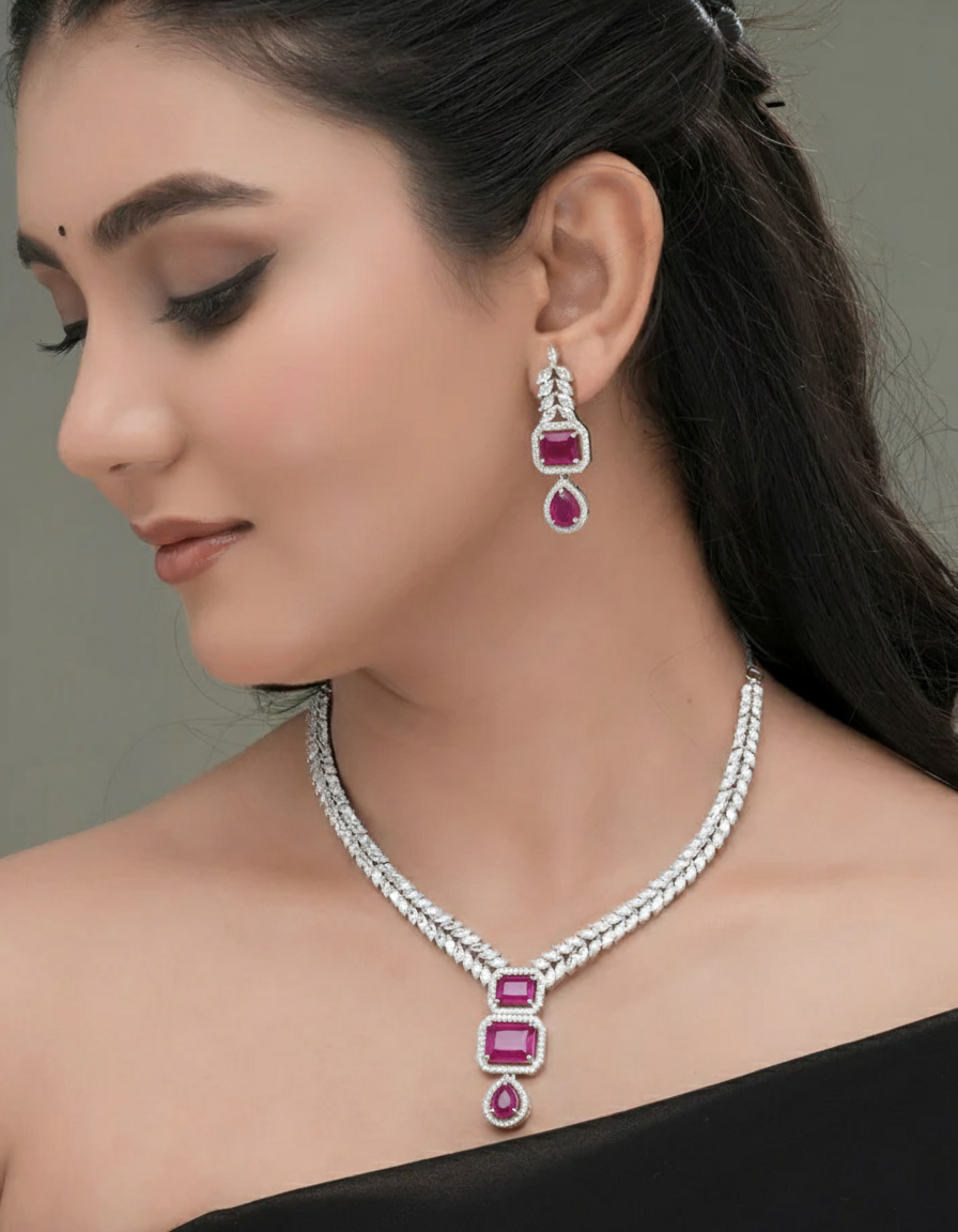 Shimmer with sophistication in this pastel pink CZ jewelry set, crafted to perfection for timeless elegance. The necklace showcases double square-cut pastel pink stones with a teardrop CZ accent, beautifully framed with dazzling cubic zirconia crystals. Paired with matching drop earrings, this set is ideal for weddings, receptions, festive occasions, and glamorous evenings.