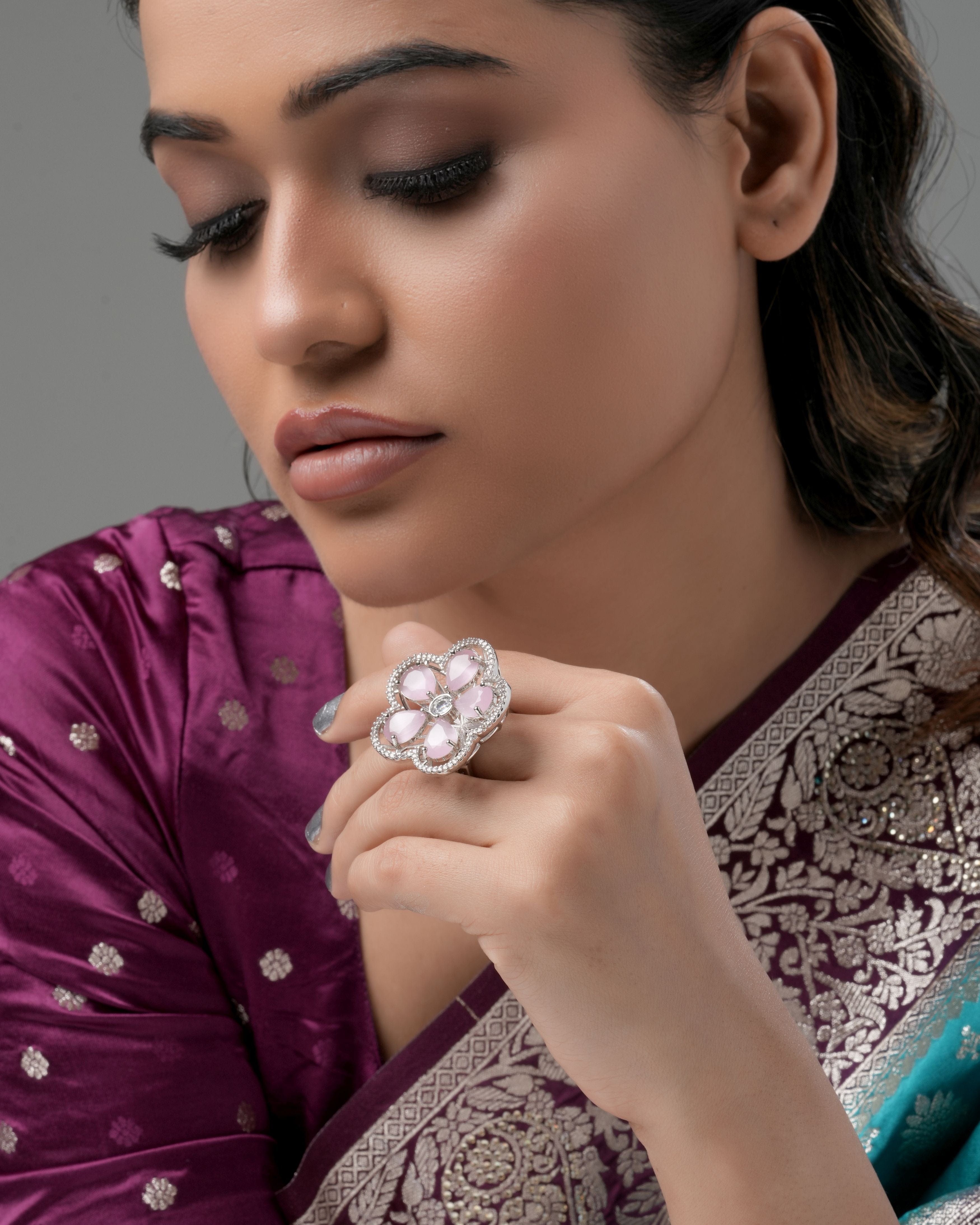 Channel feminine elegance with our Blush Petal Halo Ring. A cluster of soft pink, marquise cut crystals forms a delicate flower motif, framed by a sparkling halo of clear pavé stones. Set on a slim, rhodium plated silver tone band, this statement ring adds a touch of romantic flair to both everyday and special occasion looks.