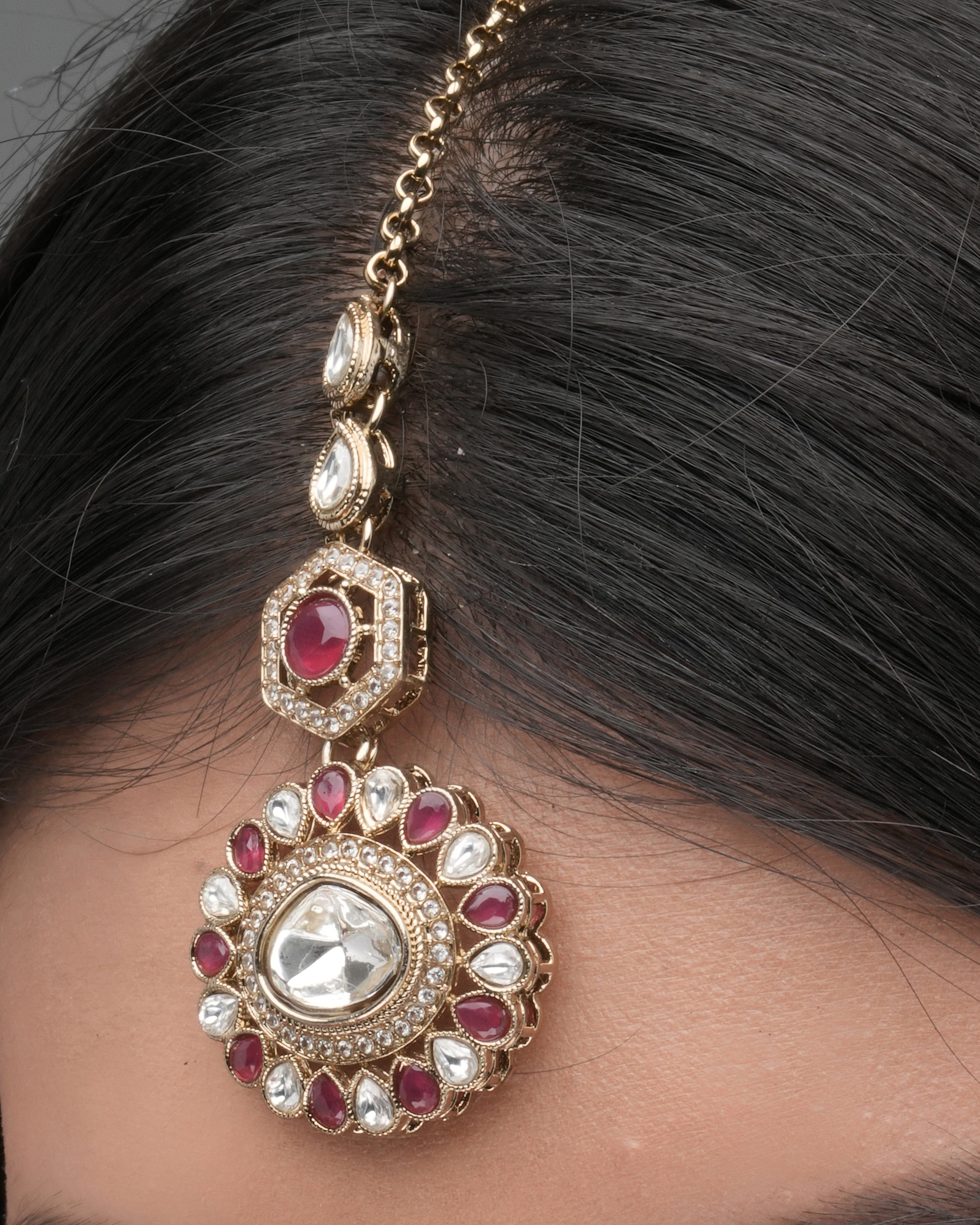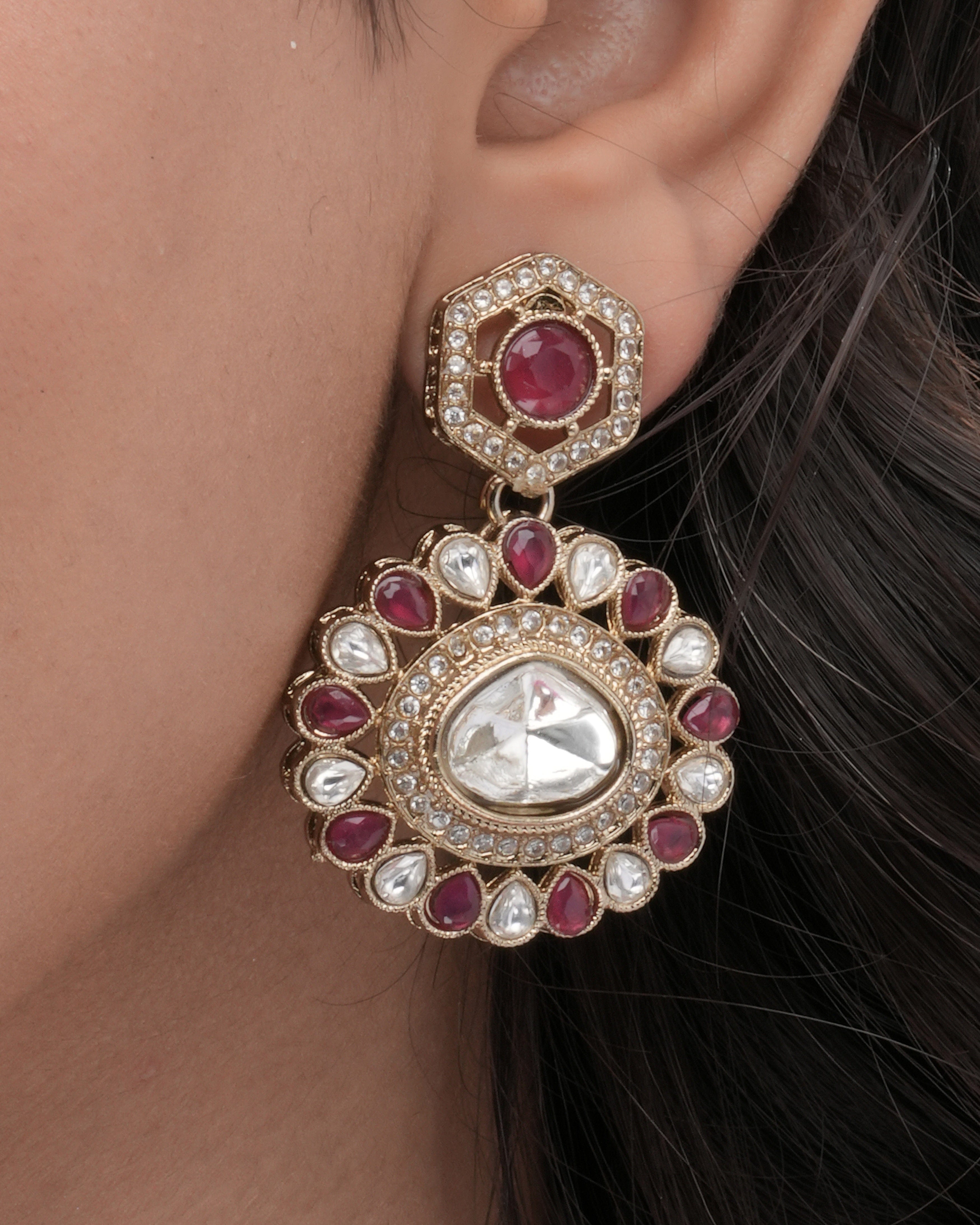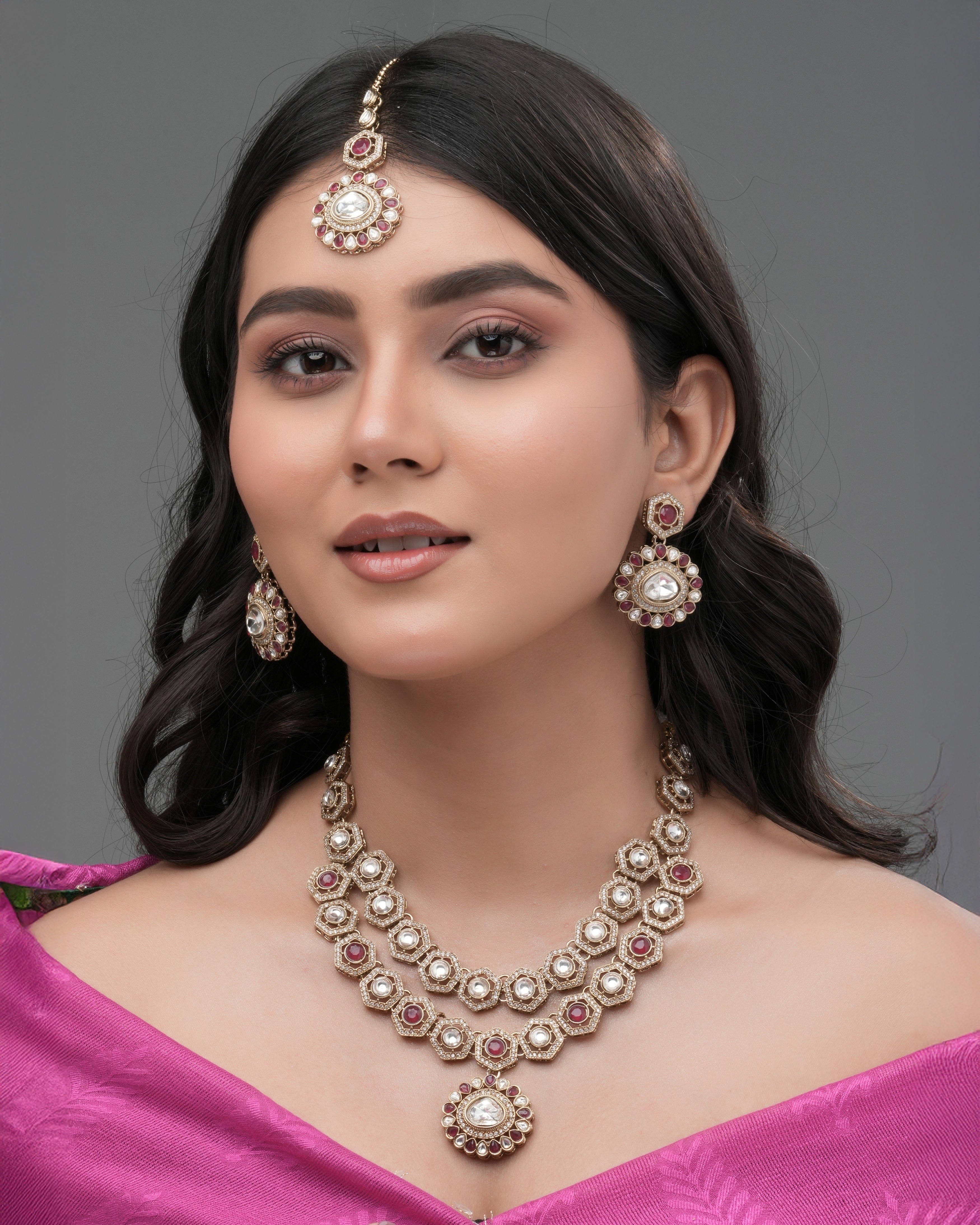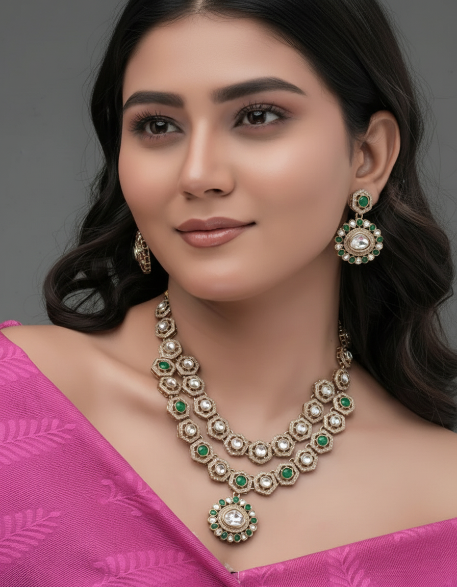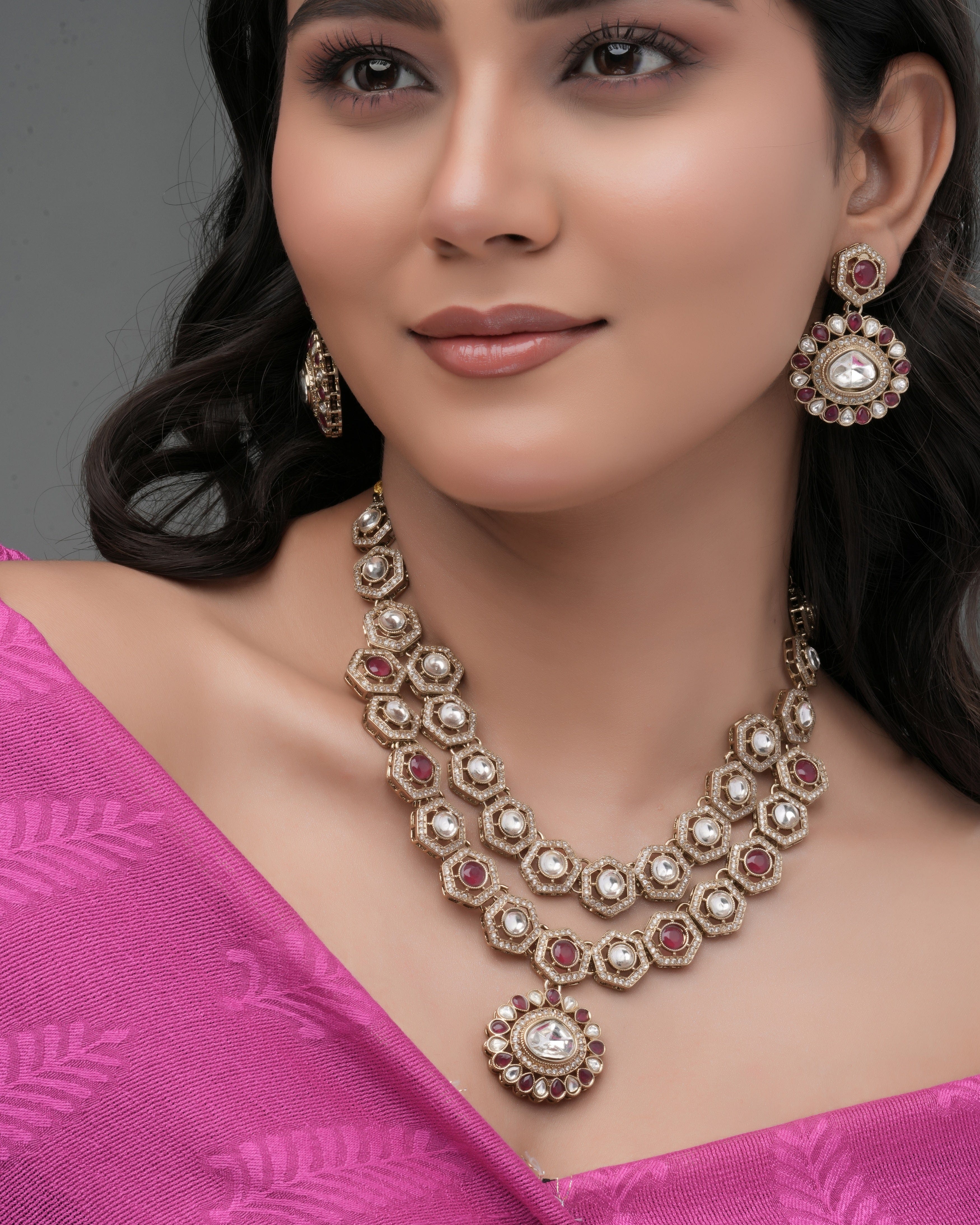 The Crimson Crest necklace offers a bold, symmetrical design using hexagonal gold units with Zedex stones and deep red accents. Its floral-style central pendant enhances the elegance, making it ideal for wedding ceremonies and festive functions.