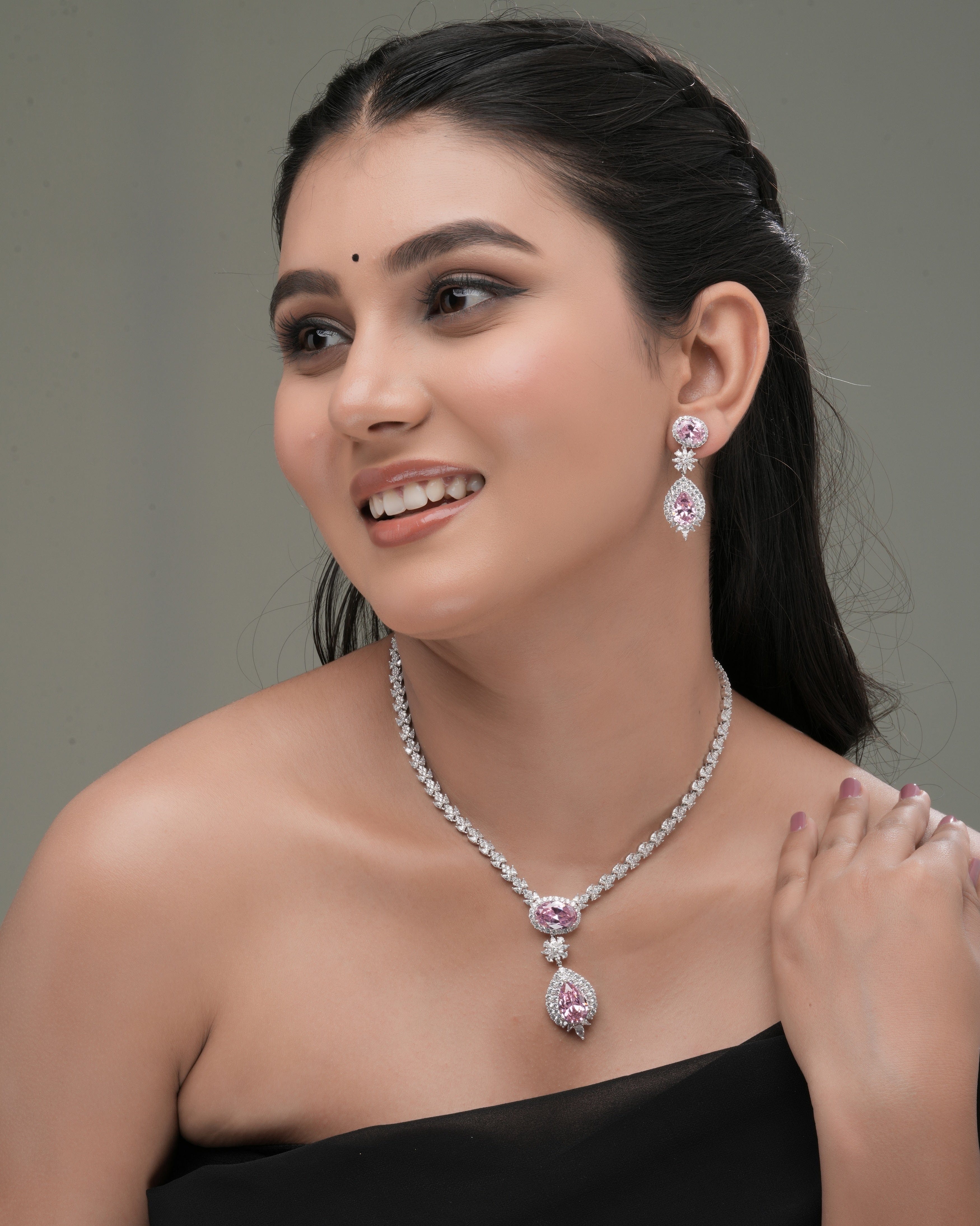 Channel refined elegance with this Duo Drop Tennis Necklace & Earring Set. Two pendants—a luxe oval and a graceful pear shaped Emerald Green Natural stone —are each haloed in brilliant cubic zirconia stones, Swarovski elements and suspended from a rhodium-plated CZ tennis chain. Coordinating drop earrings mirror the pear shaped emerald crystal and CZ halo. Perfect for enhancing Indo Western attire or adding a touch of luxe to eveningwear.