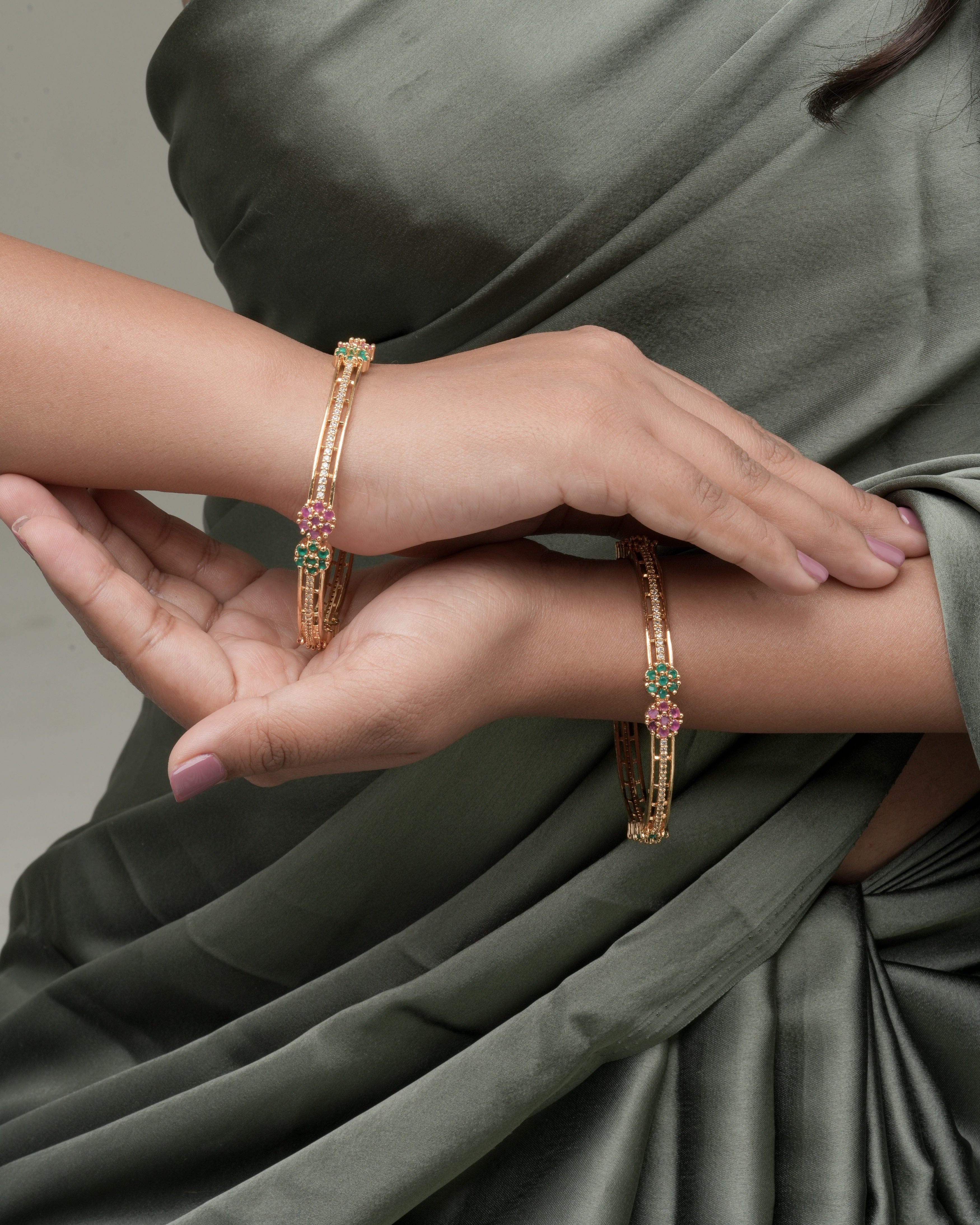 Two slender, adjustable cuffs in lustrous gold-tone finish, each featuring alternating floral clusters set with vivid green and deep pink stones. A row of clear crystals lines each band, creating a graceful cascade of sparkle. Effortlessly slide to size—no clasps or fiddly hooks—then let these colorful blooms accent any look.