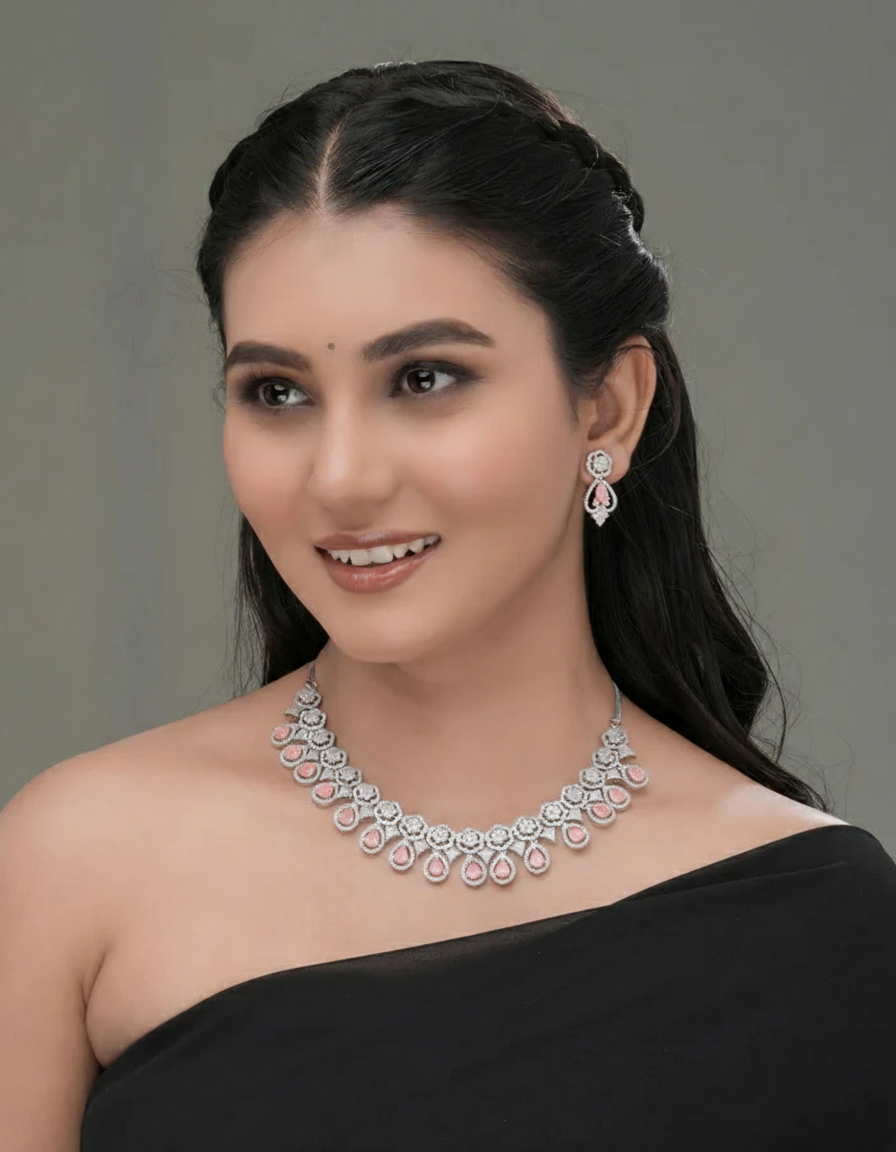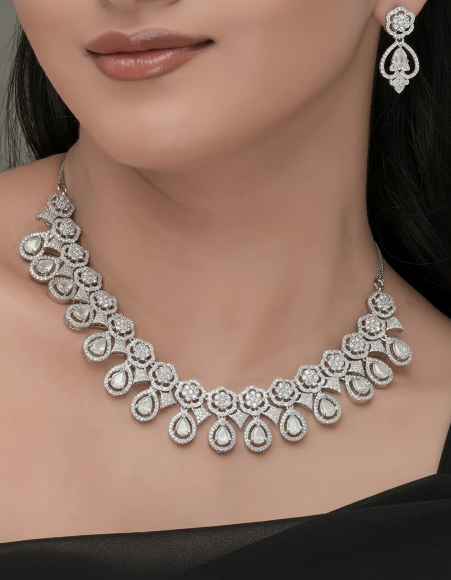 Channel verdant elegance with the Emerald Envy American diamond Choker & Earring Set. A continuous row of back set, rose cut american diamond forms a sleek silver tone band, punctuated by teardrop cut emerald green natural stone pendants. Suspended from an adjustable snake chain, the matching drop earrings mirror the choker’s teardrop motif—perfect for adding a fresh pop of color to evening gowns or polished daytime looks.