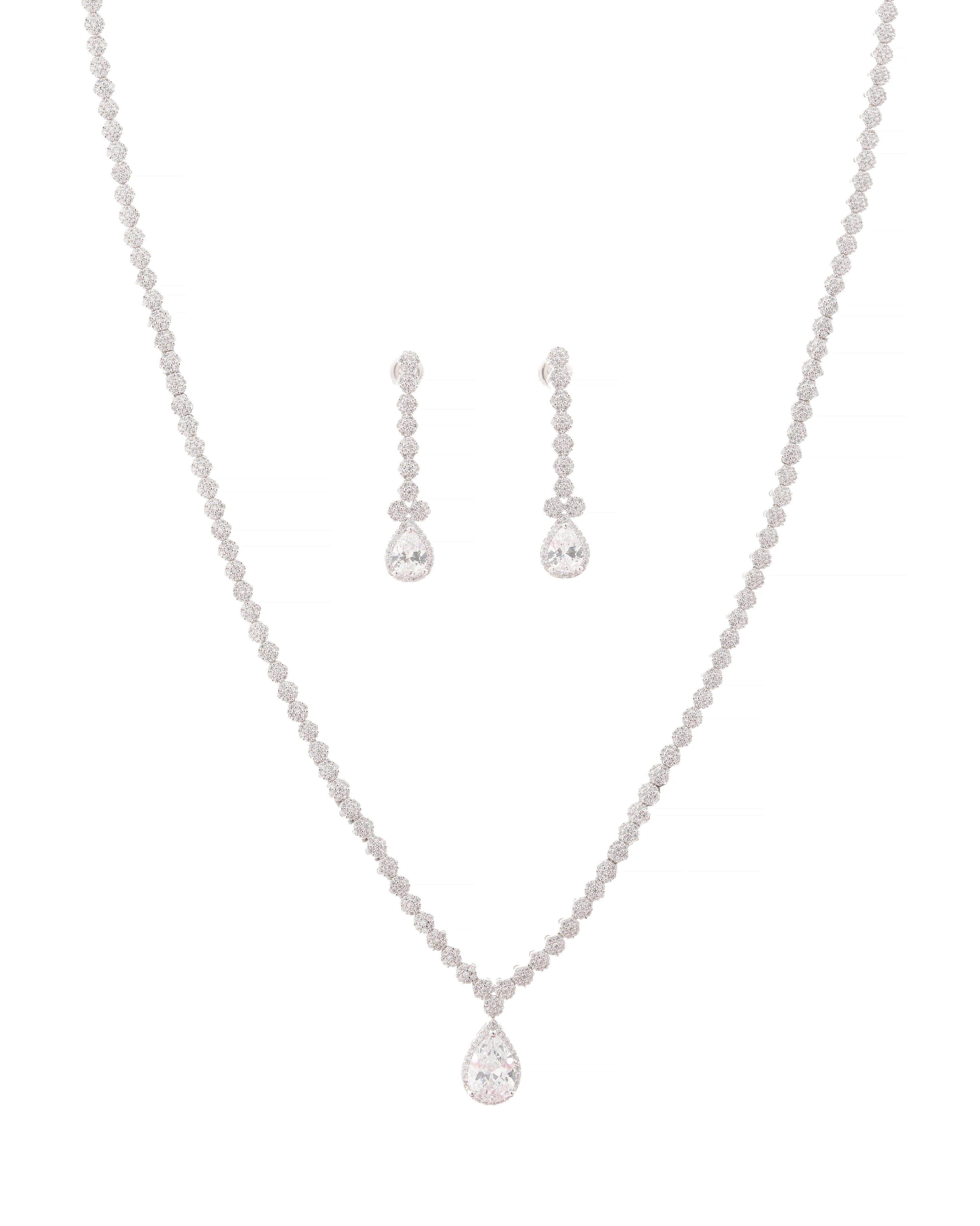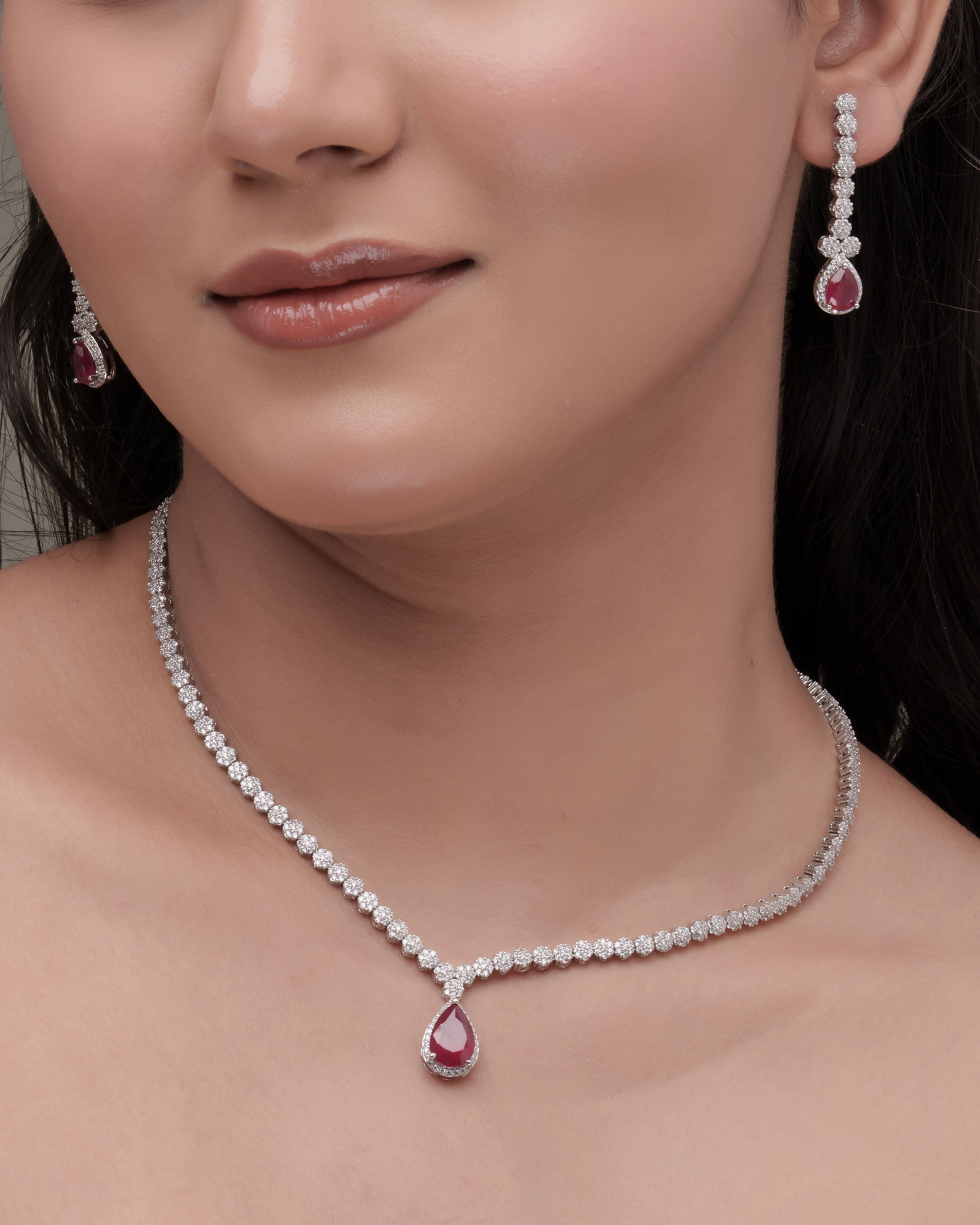 Capture attention with the Ruby Red Teardrop Tennis Necklace & Earring Set. A deep-red teardrop hangs from a sparkling row of CZ , Swarovski elements , creating a glamorous focal point. Matching ruby hued stud earrings complete the look, making this set ideal for weddings, festive celebrations, or romantic date nights