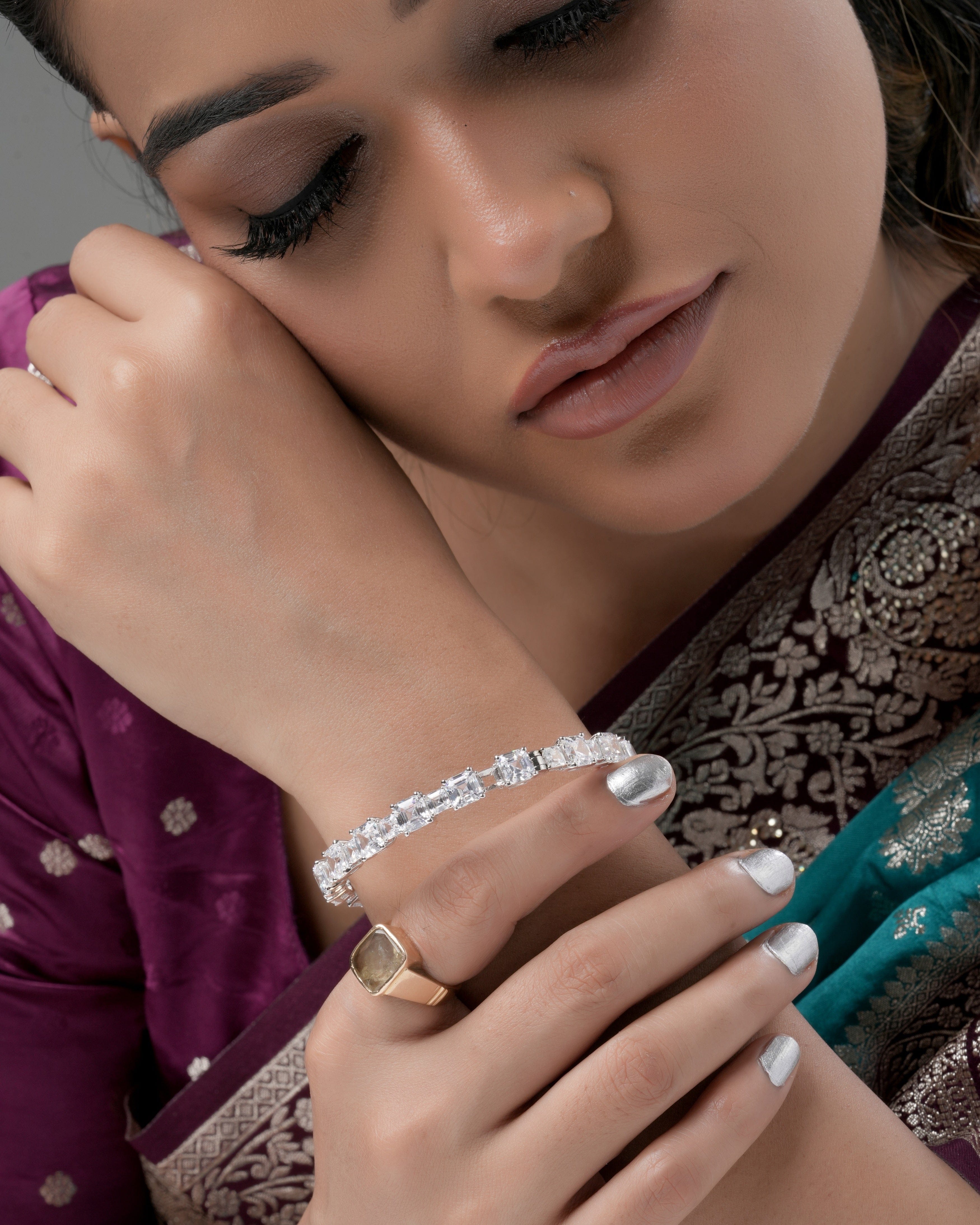 Grace your wrists with the timeless allure of the Eternal Spark CZ Swarovski elements Elegance Bangles. Exquisitely crafted, these bangles feature a seamless row of brilliant-cut High quality CZ, set in perfect symmetry to radiate unmatched brilliance with every movement. Their refined design blends modern sophistication with classic charm, making them the perfect companion for both everyday luxury and grand celebrations.