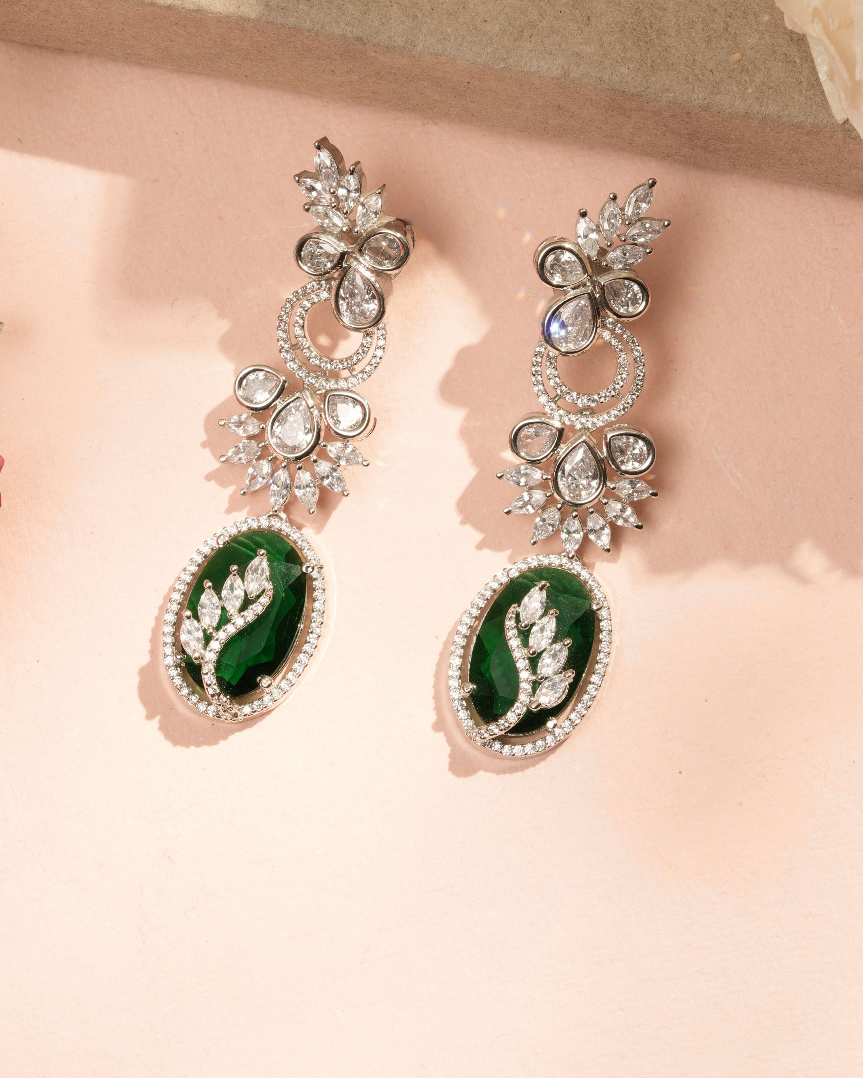 Elevate your Indo Western ensemble with these Evergreen Radiance Drop Earrings. Each earring features a vivid green centerpiece stone encircled by sparkling AD accents, all set on a gleaming rhodium plated alloy base. The intricate filigree detailing and graceful teardrop silhouette make these earrings perfect for weddings, festive celebrations, or adding a touch of glamour to your everyday look.