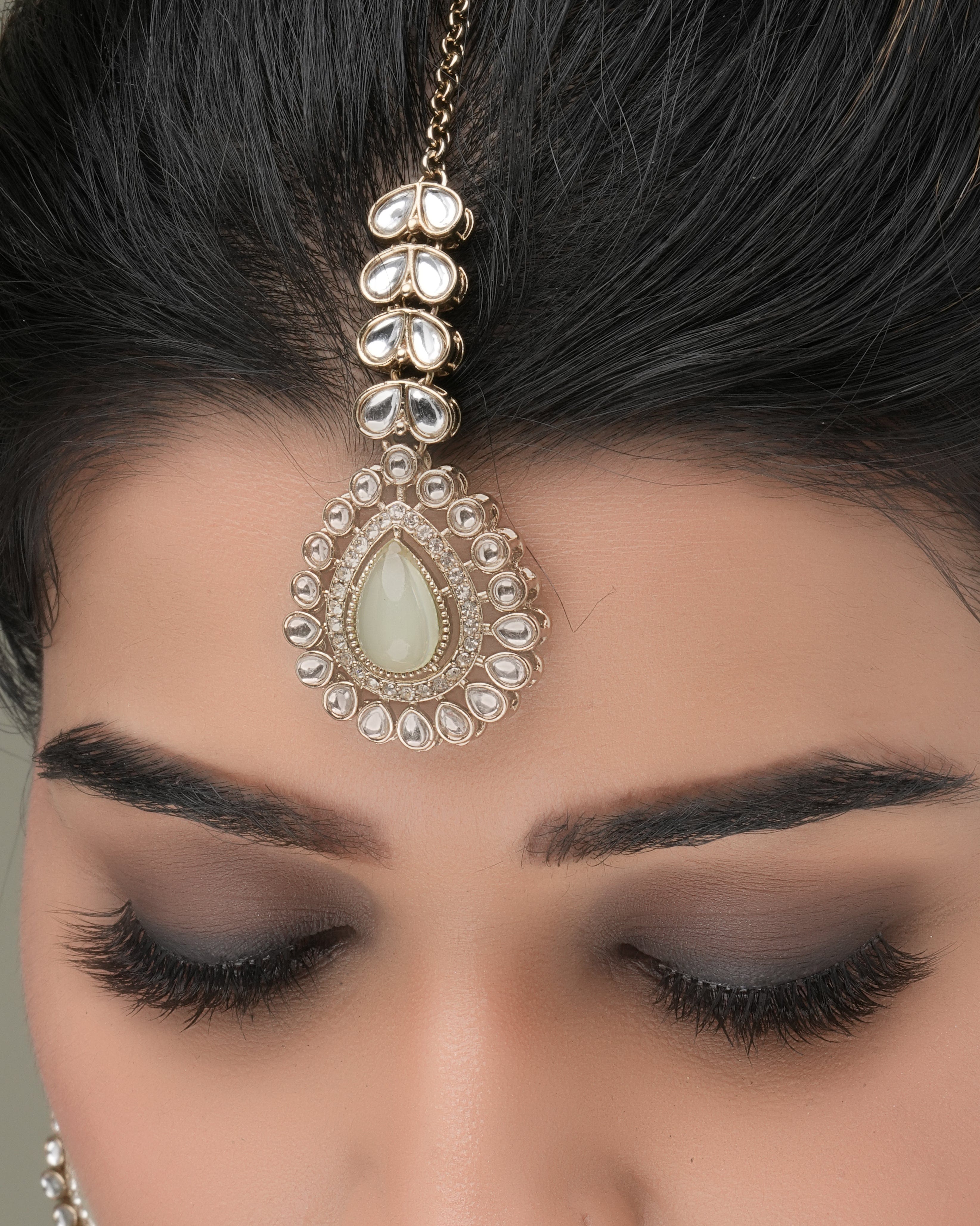 The Golden Bloom necklace evokes floral grace with its repeated pear and oval lemon Zedex stones surrounded by shimmering CZs. Its tear-drop pendant centerpiece adds dept with matching earrings and Maang Tikka, making this a show-stopping piece for special events or daytime celebrations.