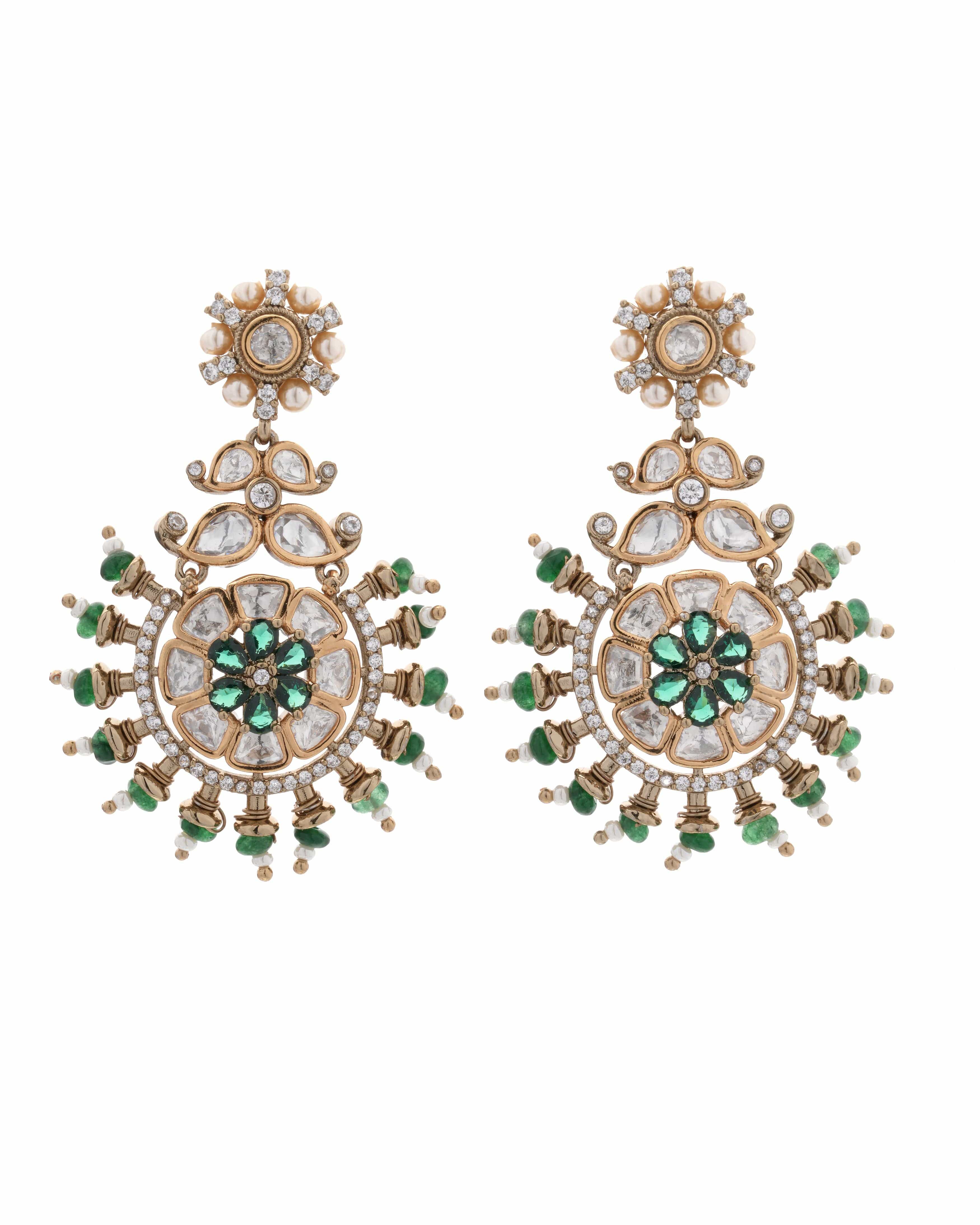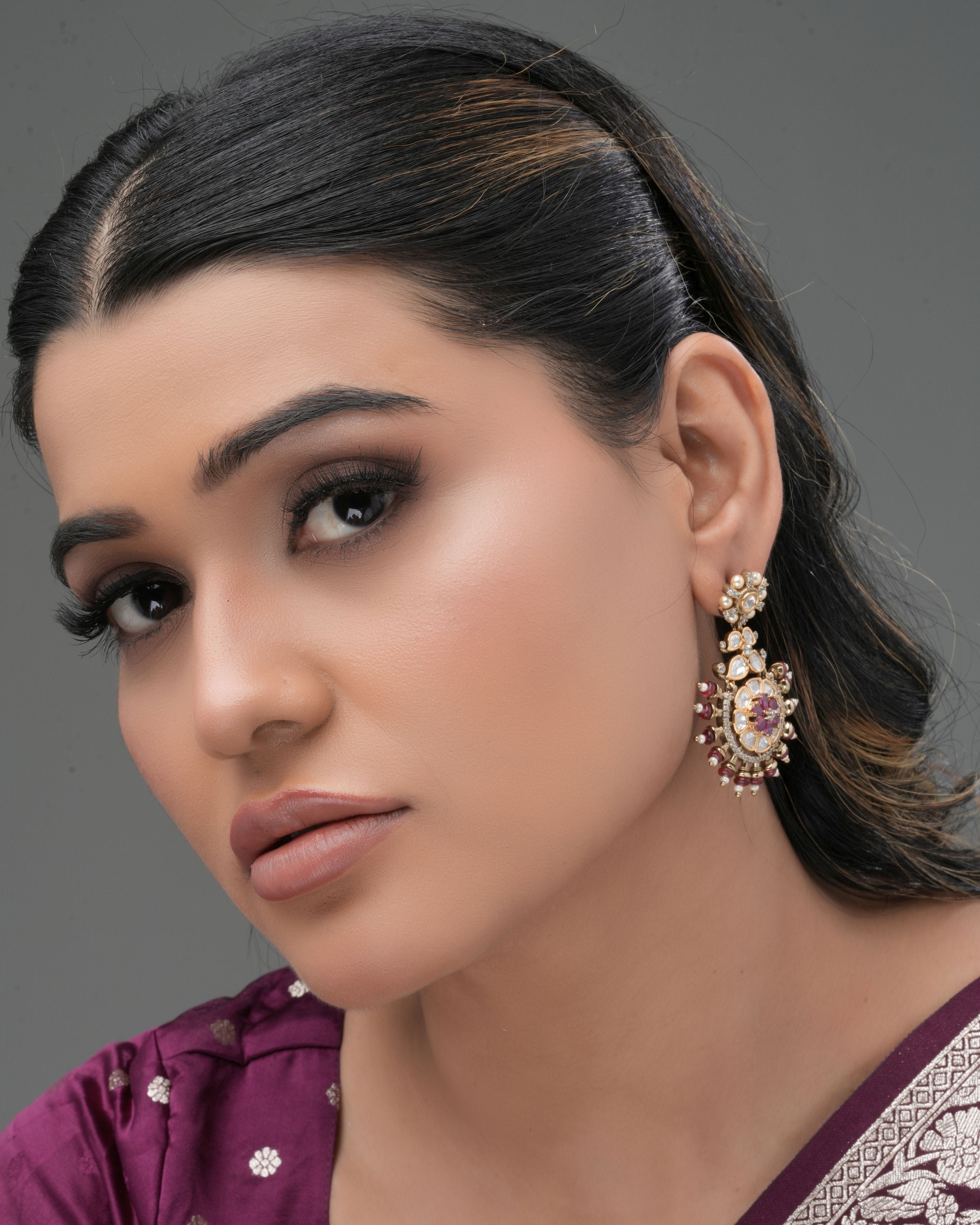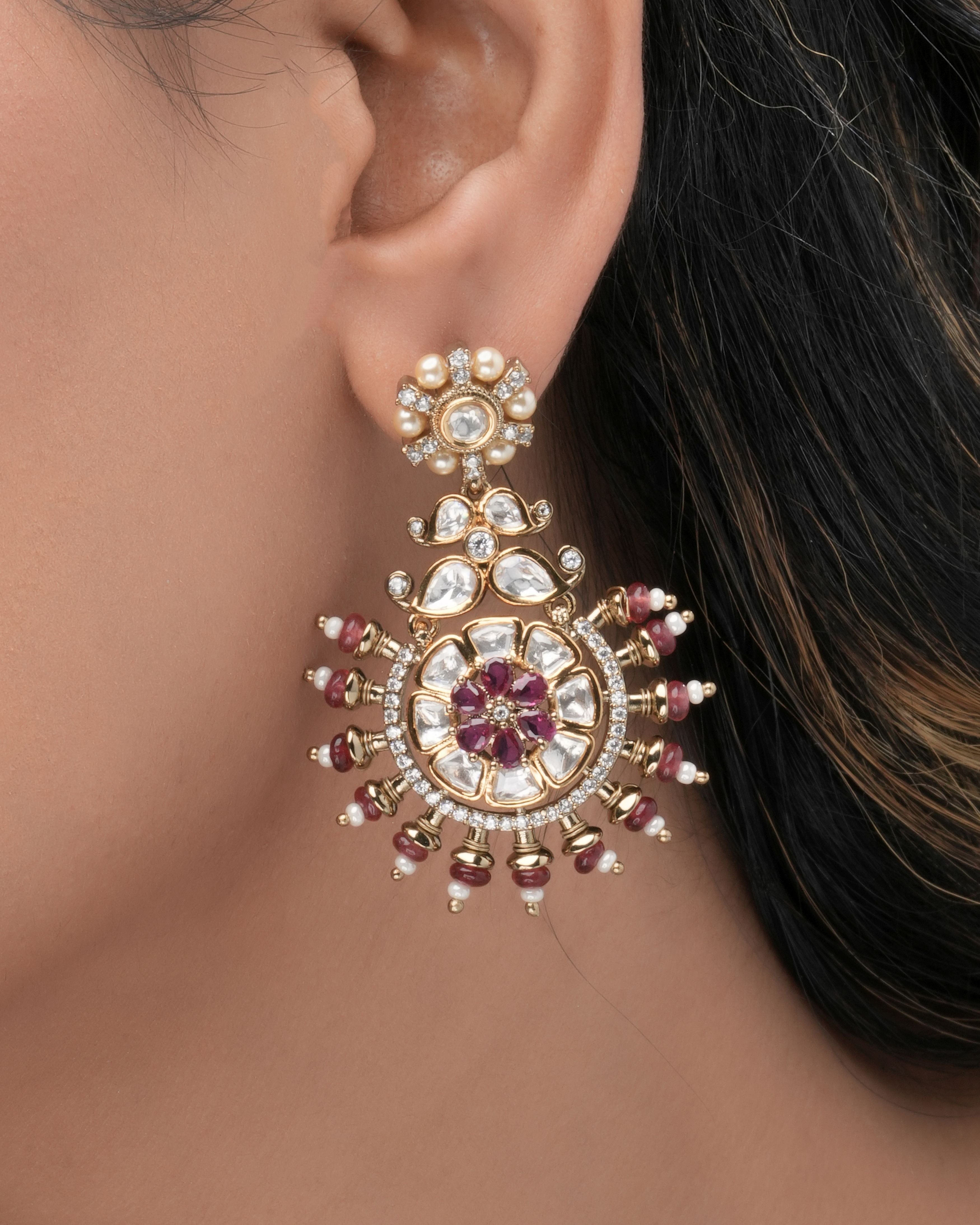 Add vibrant flair to your ensemble with the Crimson Mosaic Stud Earrings. A hand poured ruby red mozanite center is framed by a Kundan style halo of faceted glass stones and micro pavé cubic zirconia, all set in an antique gold tone bezel. A fringe of pearls and ruby tone beads dangles delicately below. These statement studs combine traditional craftsmanship with contemporary sparkle—perfect for weddings, festive celebrations, or adding a pop of color to any look.