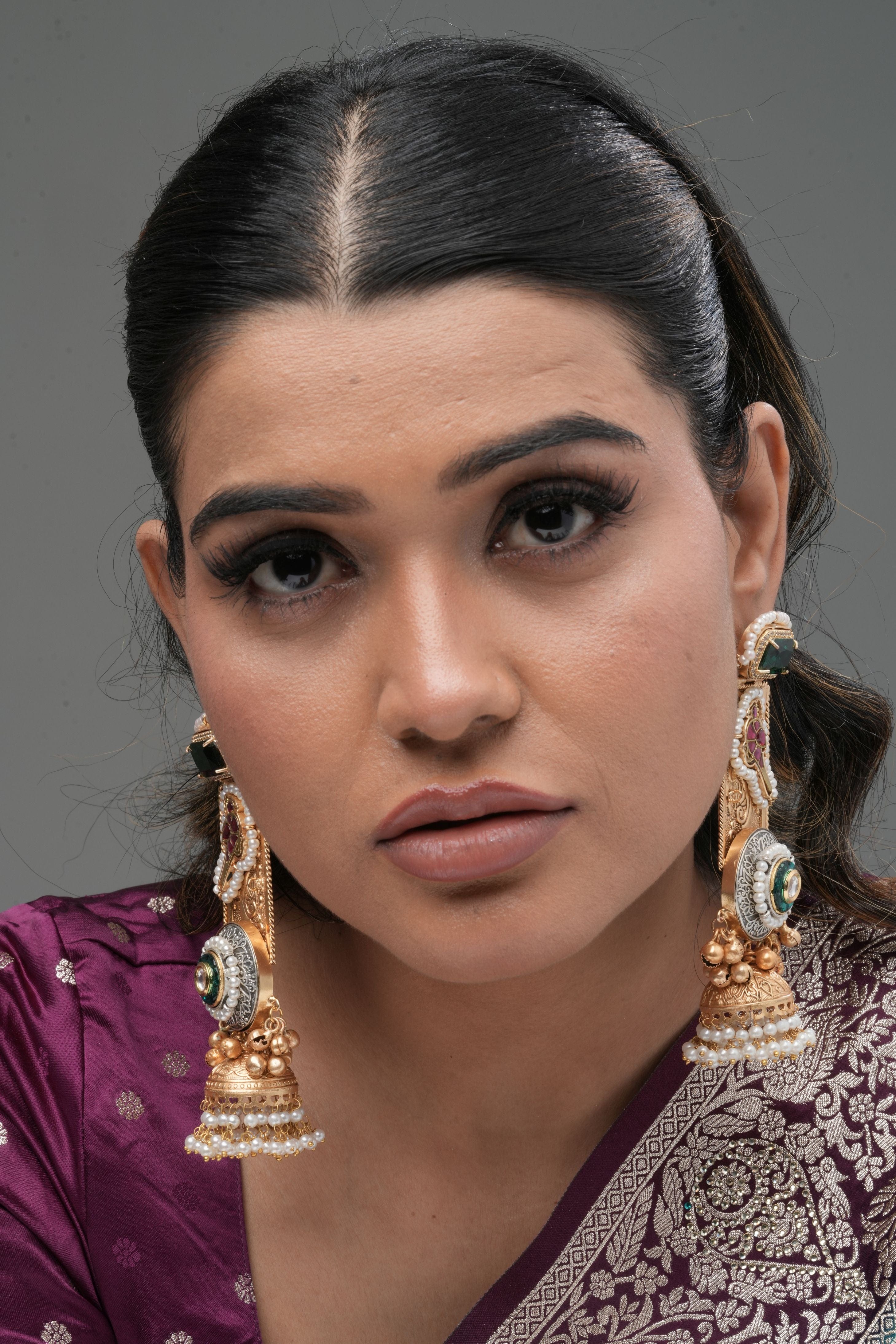 This unique pair of handmade temple-style ear tops features an elegant dual-tone finish in gold and antique silver, highlighted with rich emerald green and red stone accents. The tops are paired with a golden bead chain and intricate pearl edging, adding a regal touch to any traditional outfit. Perfect for festive occasions, bridal wear, and cultural events.