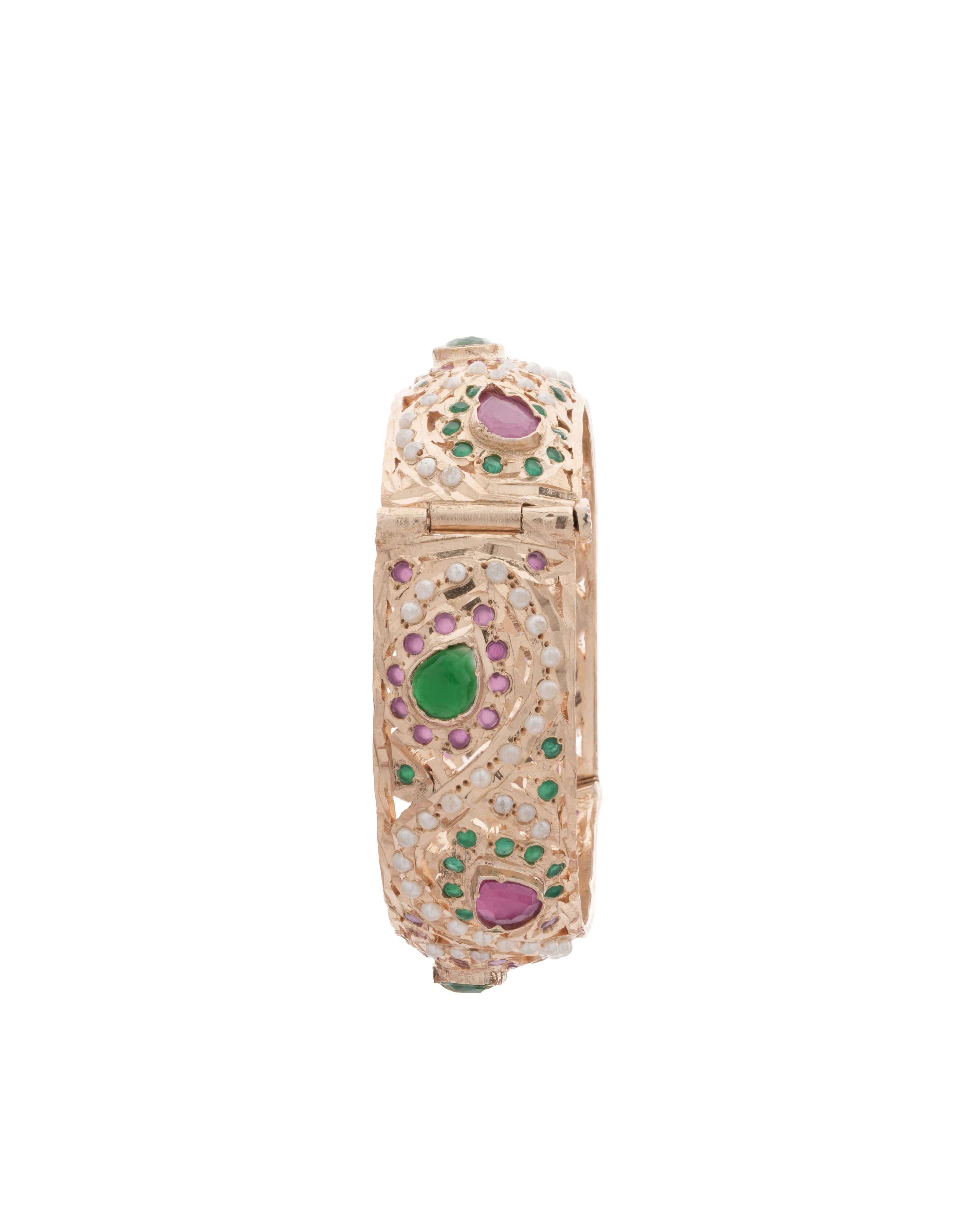 Celebrate tradition with timeless elegance through the Royal Heritage Bangles, a stunning pair of jewelry crafted to perfection. These gold-tone bangles feature a rich blend of emerald-green and ruby-pink semi precious stones, intricately embedded with delicate pearl accents. The lattice-style design and fine craftsmanship add a regal touch, making them the perfect accessory for weddings, festive occasions, and cultural celebrations.