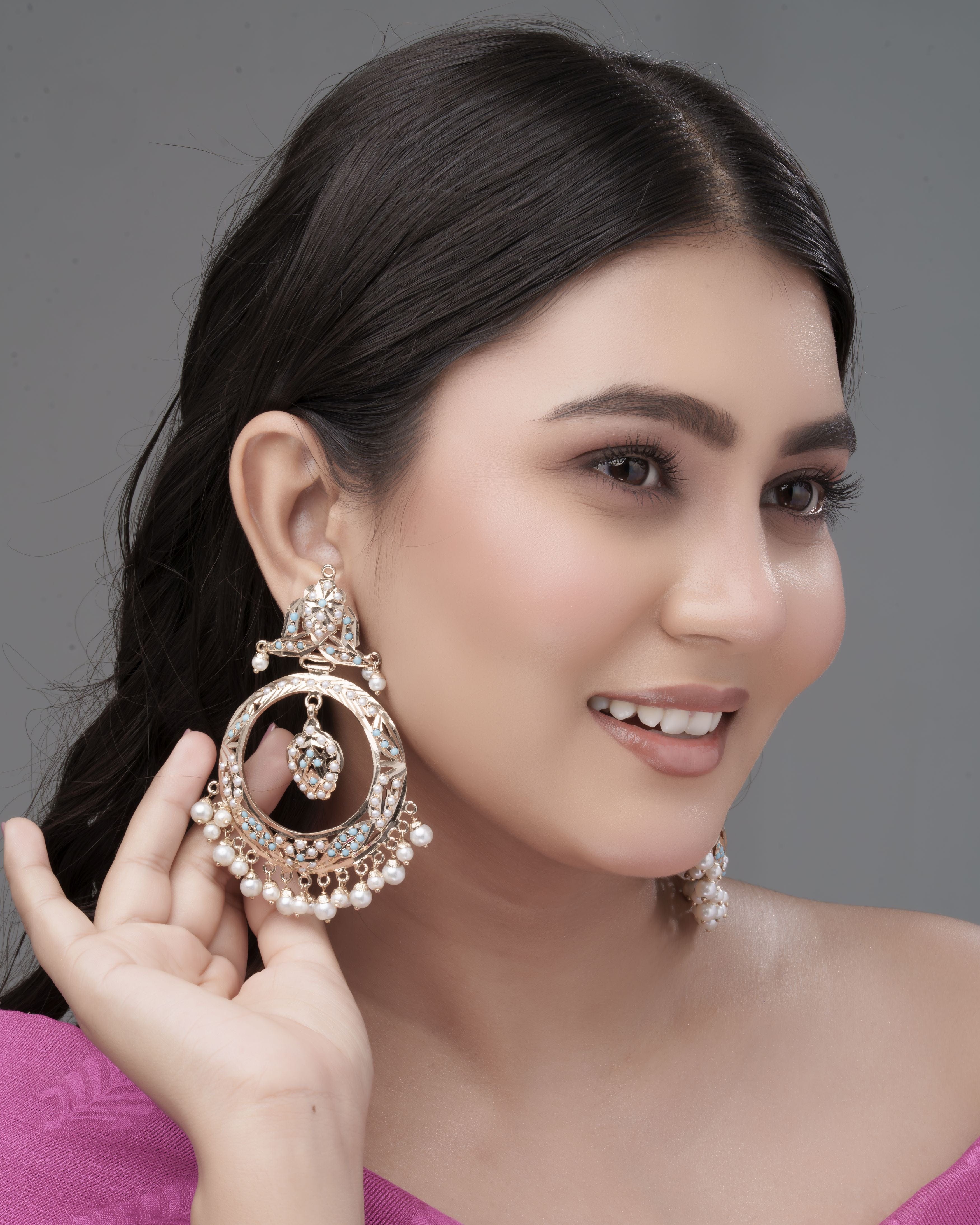 Make a statement with these Teal Symphony Jadau Hoop Earrings, where traditional Jadau craftsmanship meets contemporary style. Each hoop is cast in a warm 22K gold tone alloy and hand set with vibrant turquoise semi precious stones, shimmering clear crystals, and a playful fringe of lustrous natural pearls. Lightweight yet eye catching, they’re the perfect finishing touch for weddings, festive occasions, or elevating any evening ensemble with a pop of color and heritage-inspired flair.