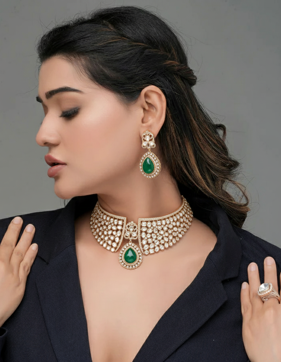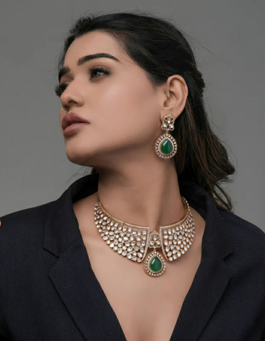 Make a royal impression with this ruby red teardrop jewelry set. The intricately designed gold-toned necklace features dazzling crystal embellishments, centered with a bold red teardrop pendant. Paired with matching earrings, this set is the perfect choice for weddings, festive occasions, or elegant evening wear.