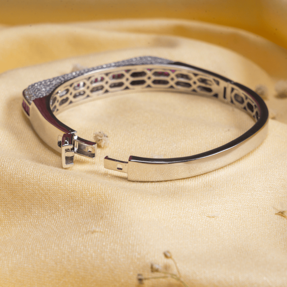 A smooth row of ruby-red princess-cut stones adds a vibrant pop of color — creating a powerful contrast that stands out beautifully in photos and special events. Designed with a secure and comfortable fit, this bracelet makes the perfect accessory for parties, weddings, and luxurious evenings out.