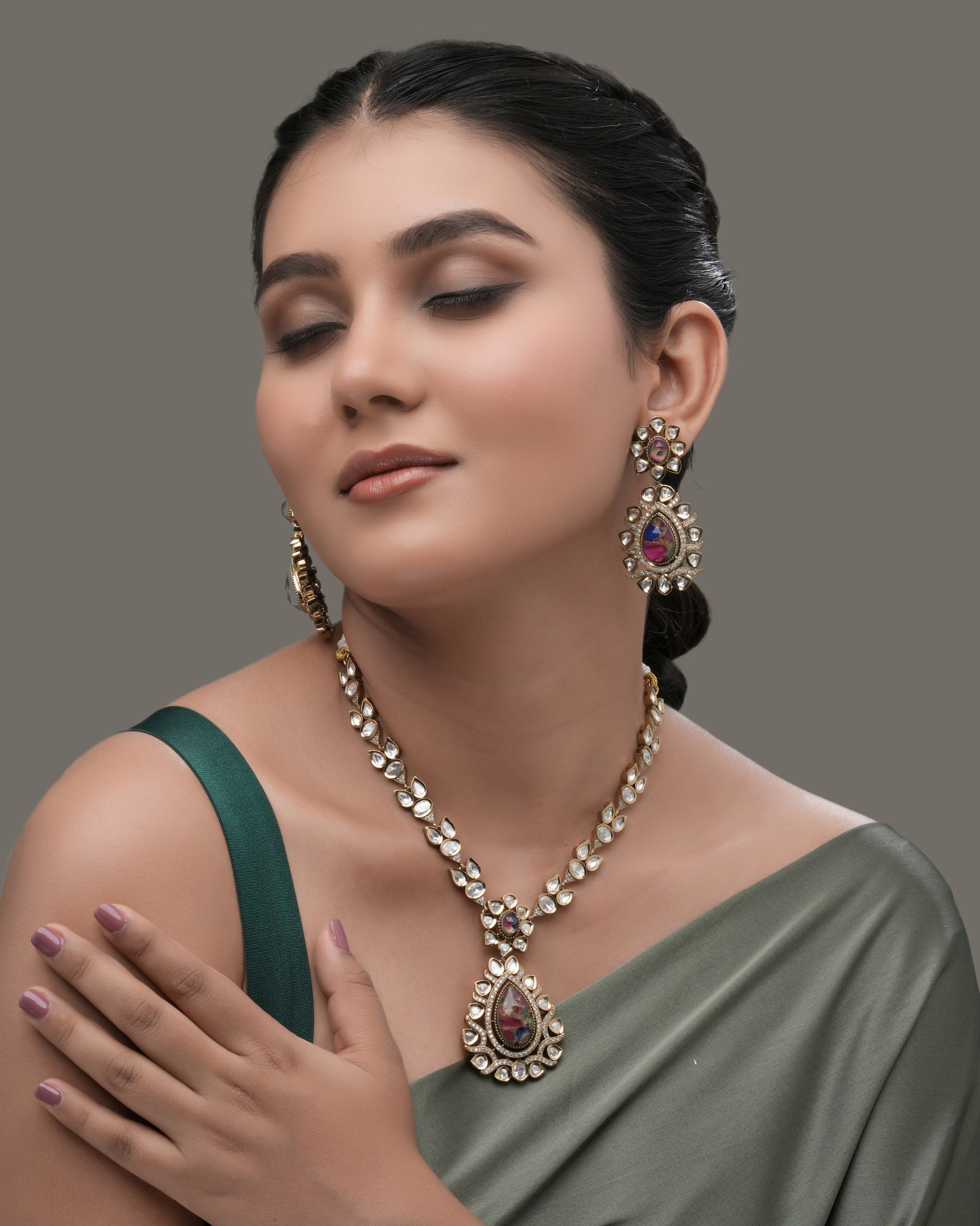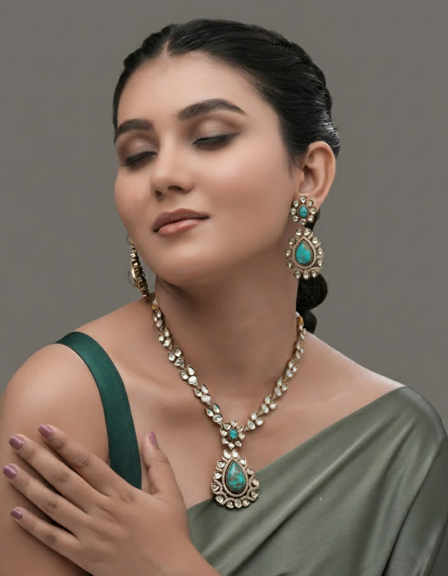 Materials: Alloy,Natural granite Stone Teardrop with blue portrait leaf motifs, Floral Kundan layout with leaf-shaped motifs chain Cz