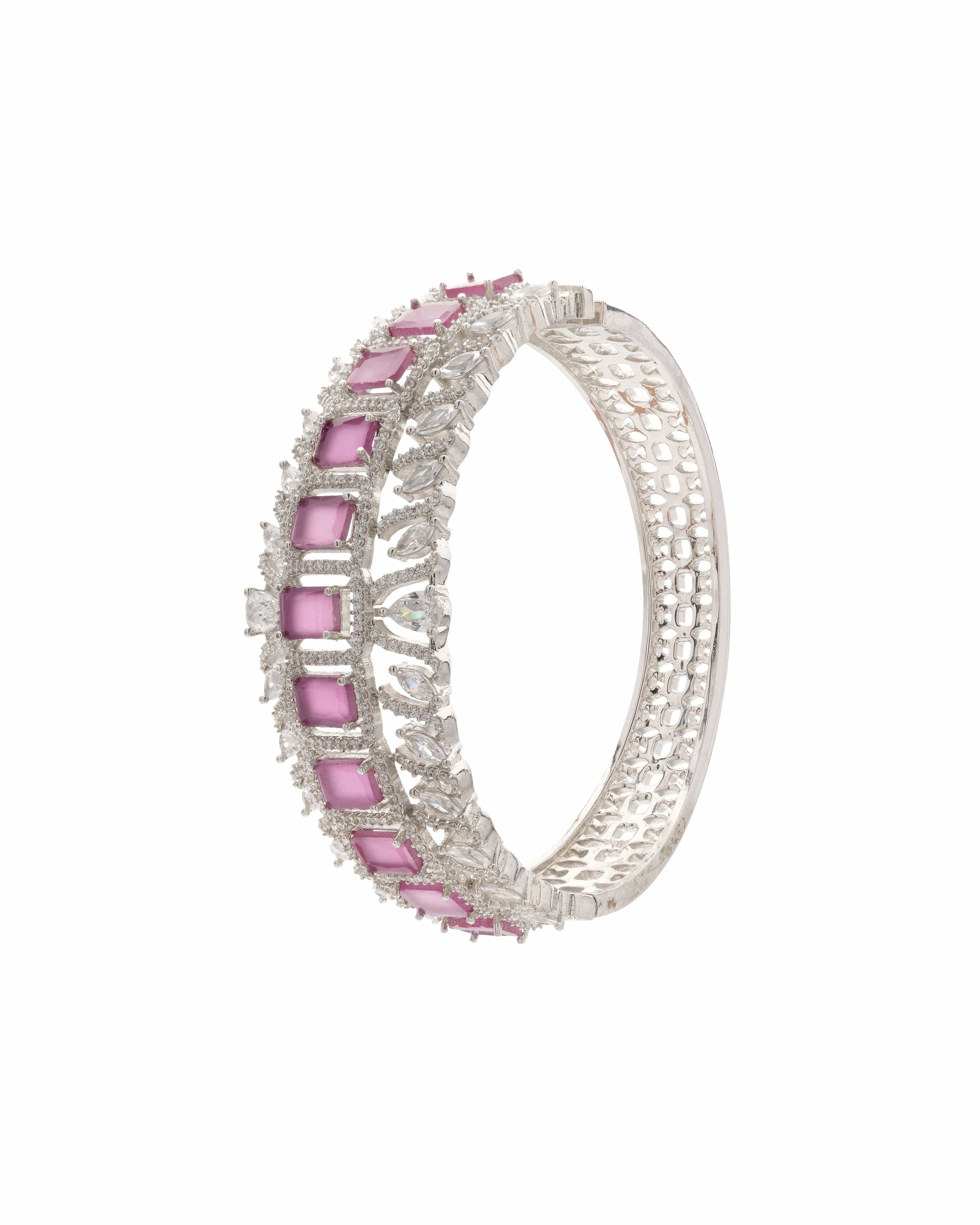 A bold and glamorous bangle, this piece features radiant deep pink stones arranged in a square-cut channel setting, framed with intricate Cubic Zirconia detailing. Its layered crown-like silhouette and high-polish silver plating make it a perfect choice for festive occasions or standout accessory moments. Raised tiara-inspired upper crown layer with alternating teardrop CZs, Sleek silver-finish backing with detailed perforated design for breathability.